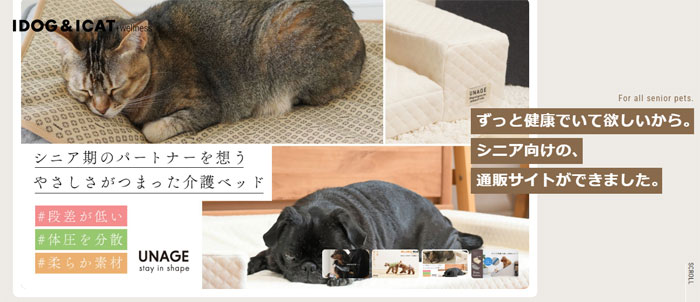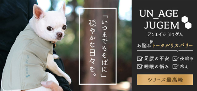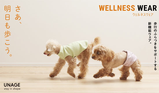 UNAGE(アンエイジ)ウェルネスウェアが看板商品。血流促進、体幹安定、リラックス効果、歩行改善などが期待される特許技術(有効成分を生地にプリント)を採用。シニア犬・高齢犬の介護サポートに特化している。